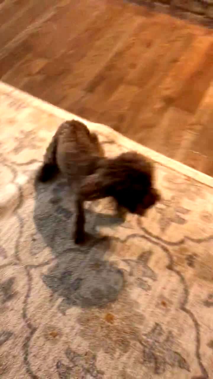 A poodle dog wears a diaper and flips around repeatedly in the living room. No audio.