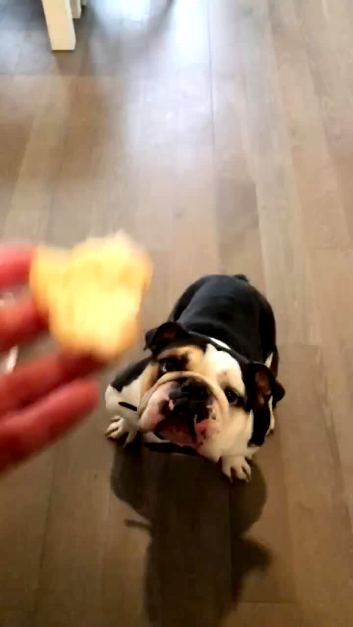 A Bulldog dog tries to jump and catch a treat, but he misses it and falls. Slow motion.