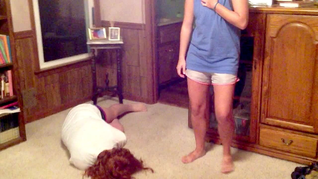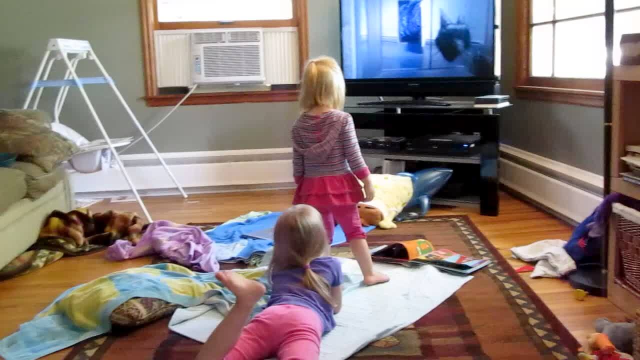 A young girl screams/ cries on the floor whenever her tot sister stands between her and the TV and stops when she steps away.