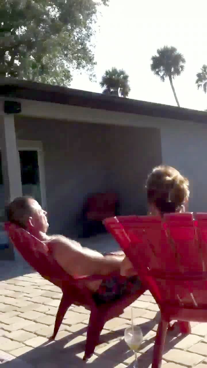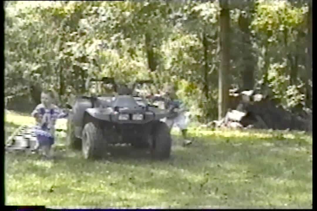 A girl in a Michael Myers mask sneaks up on her mom in a lawn chair outdoors. Her mom screams and gets out of her chair shouting "What are you doing?!"