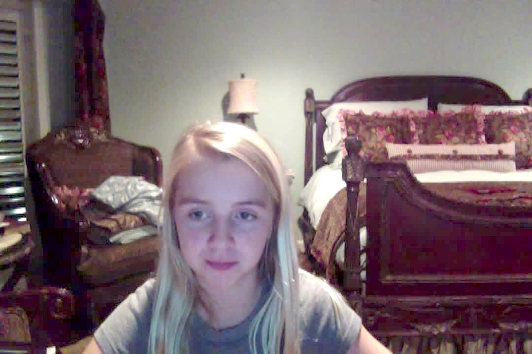A young girl walks into her sister's bedroom wearing a scary Chucky from the movie "Childsplay" mask. She walks up to her sister while she is on the computer. Her sister screams and runs out angry. Pranks. Caucasian.