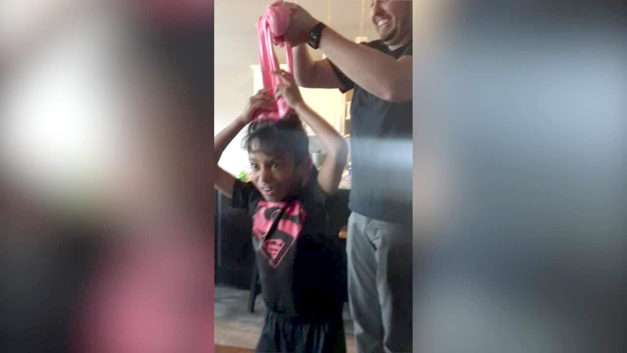 A tot boy slides down a slide and his hair sticks up in all directions from the static electricity on a playground. Slow motion