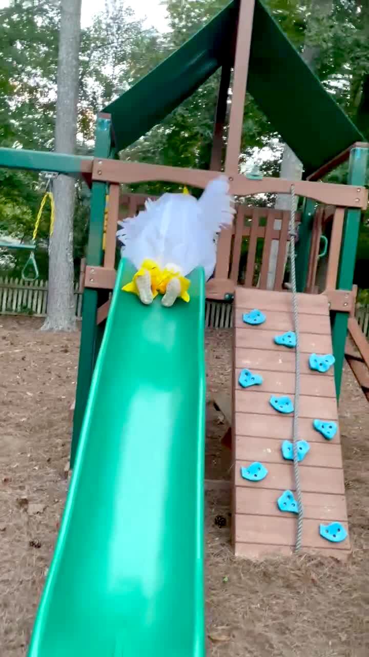 A young girl wearing an inflatable chicken costume tries to go down a slide in a park. The head of the costume gets stuck at the top of a slide. Halloween.
