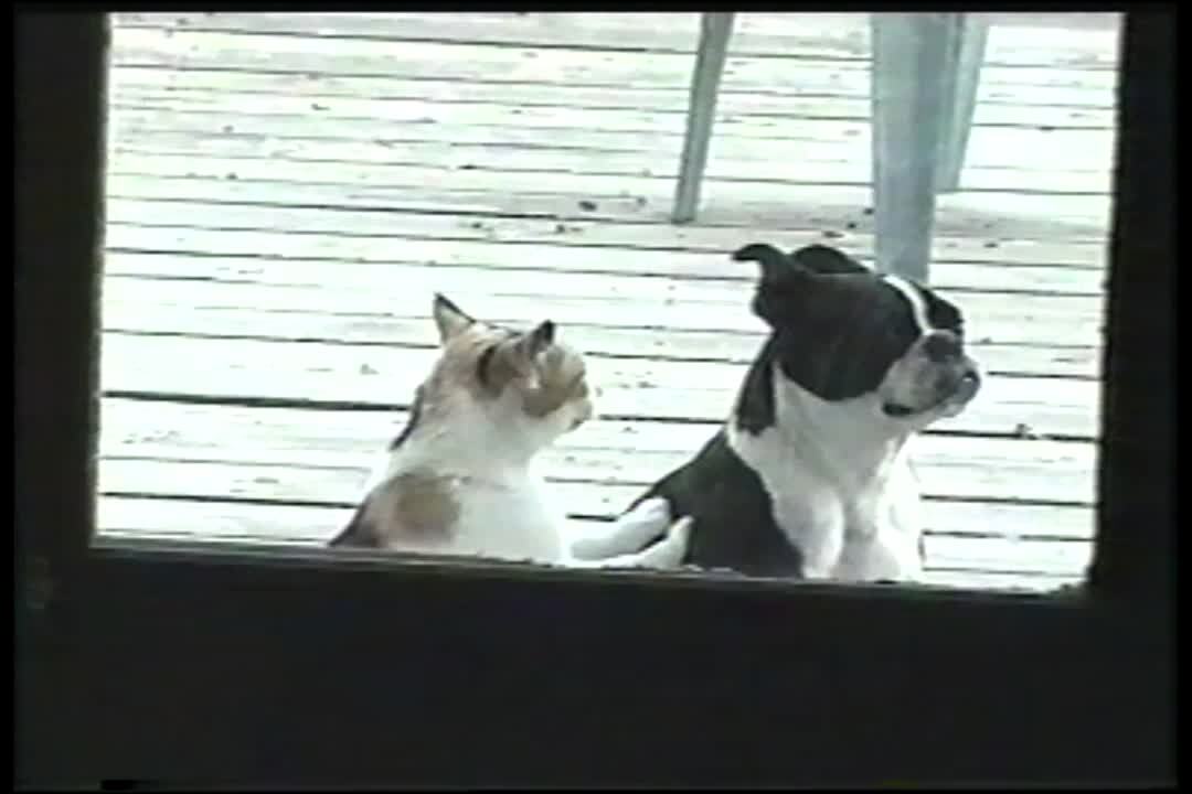 Cat/dog. Black cat gives dog rapid punches while they sit on owner's lap.