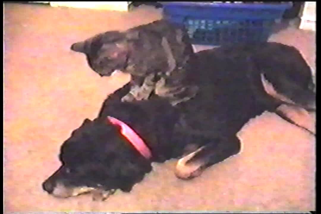 Cat massages Rottweiler dog's back. Dog moans as the cat gives him a back rub.