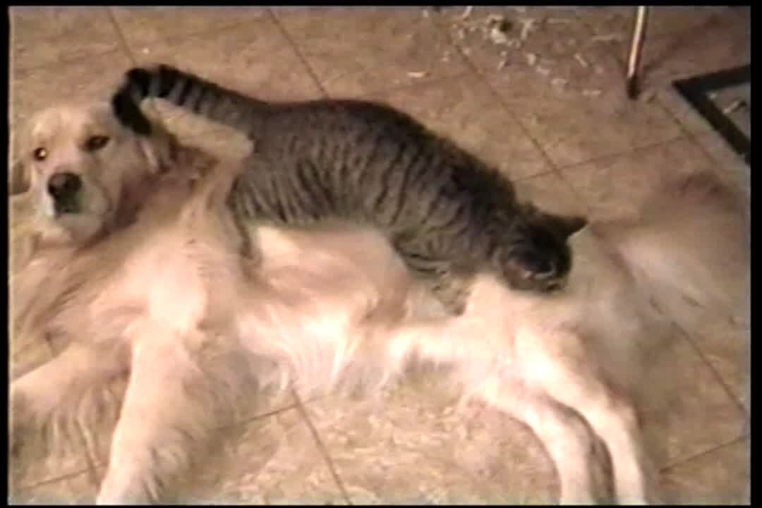 Cat kneads golden retrievers dog's chest. Look like he is hypnotizing him. Animal love.