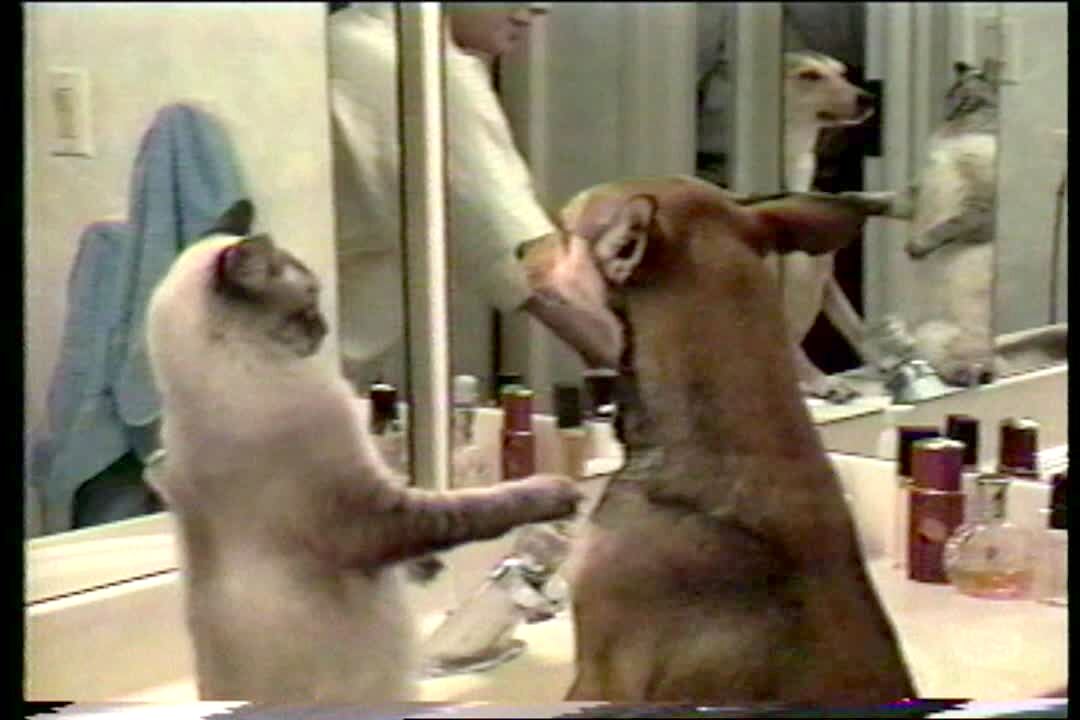 Cat helps groom dog.