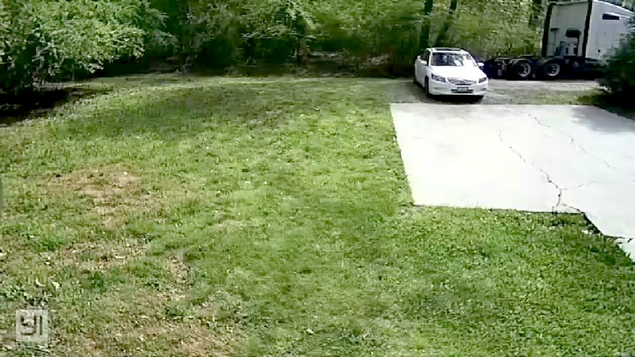 A dog runs through the yard and jumps through the window screen on the back patio. Security footage.