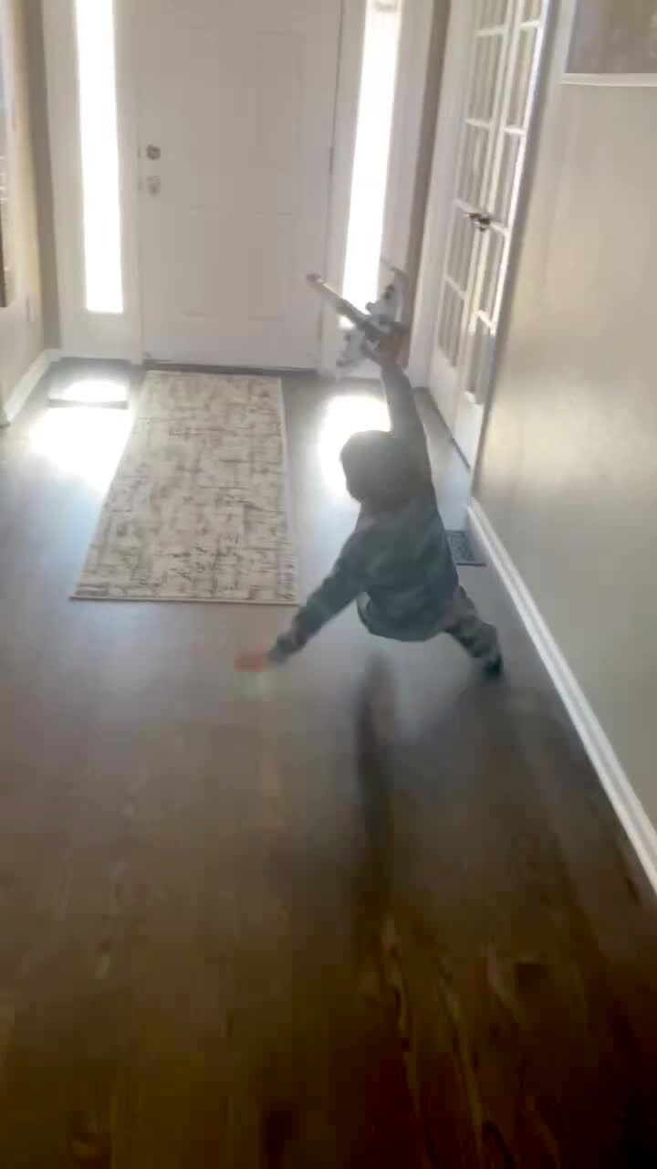 A man and teen boy in a hallway try to get a bat out of the attic and they scream and run away when it flies towards them.