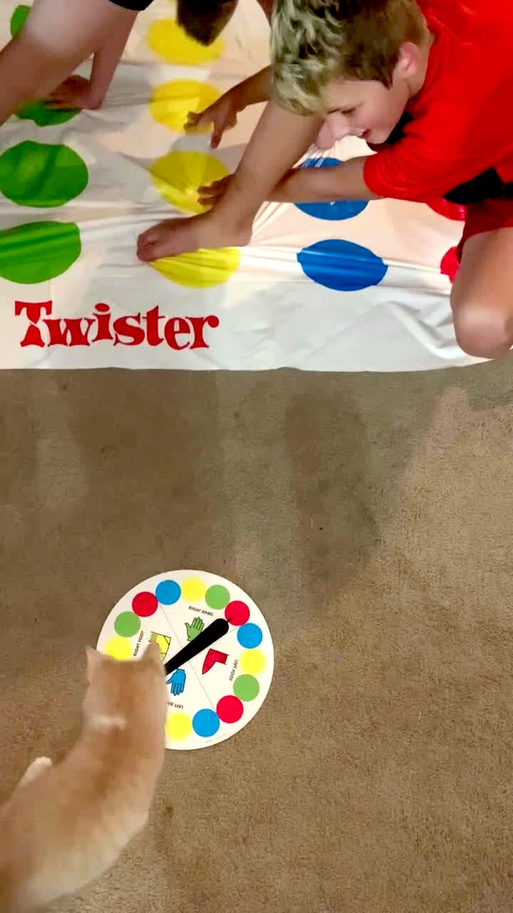Cat sits on a bed next to a desk. Pet rat sneaks up onto the bed, jumps at the cat, the cat jumps off the bed.