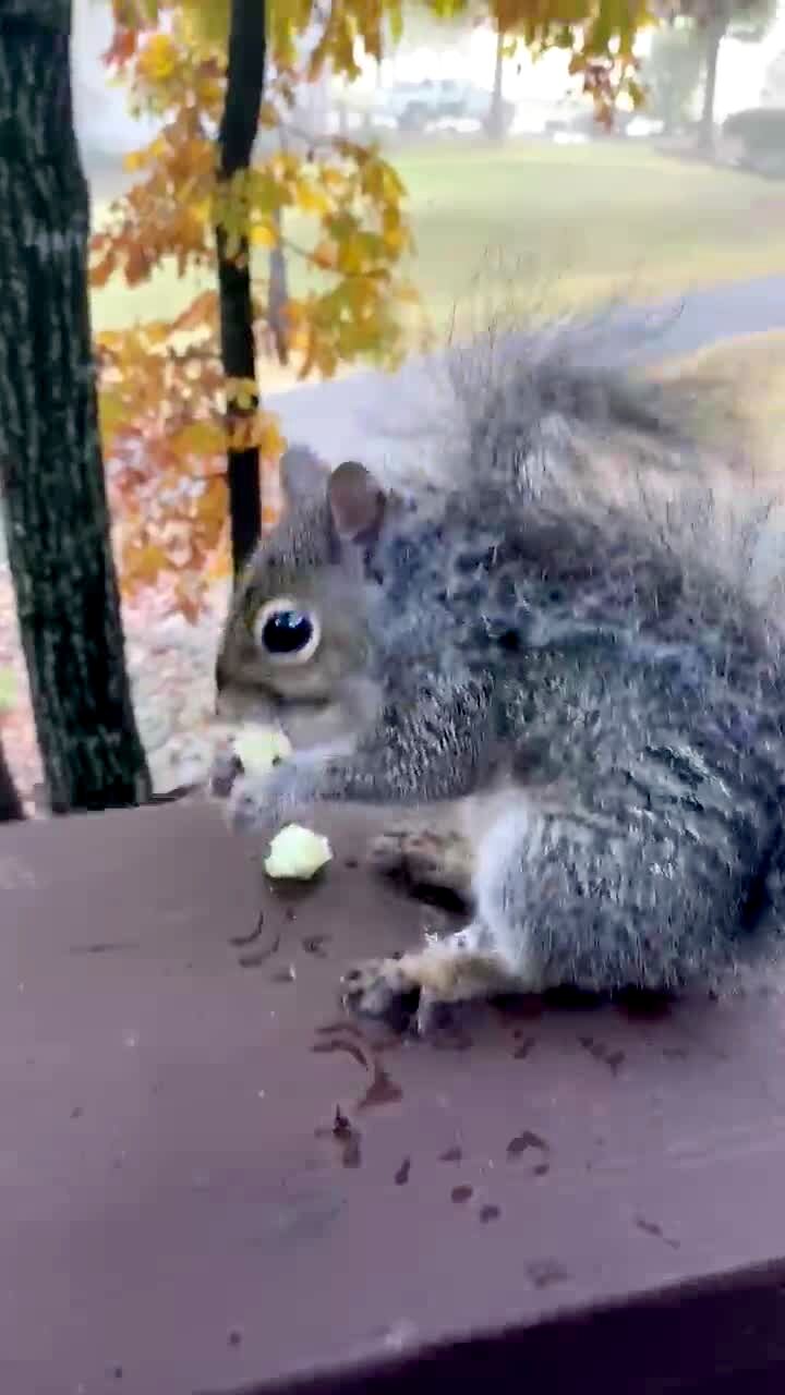 A man opens a window while a squirrel runs around a storage room, then the squirrel climbs up his leg and makes him scream and jump around. Security footage.
