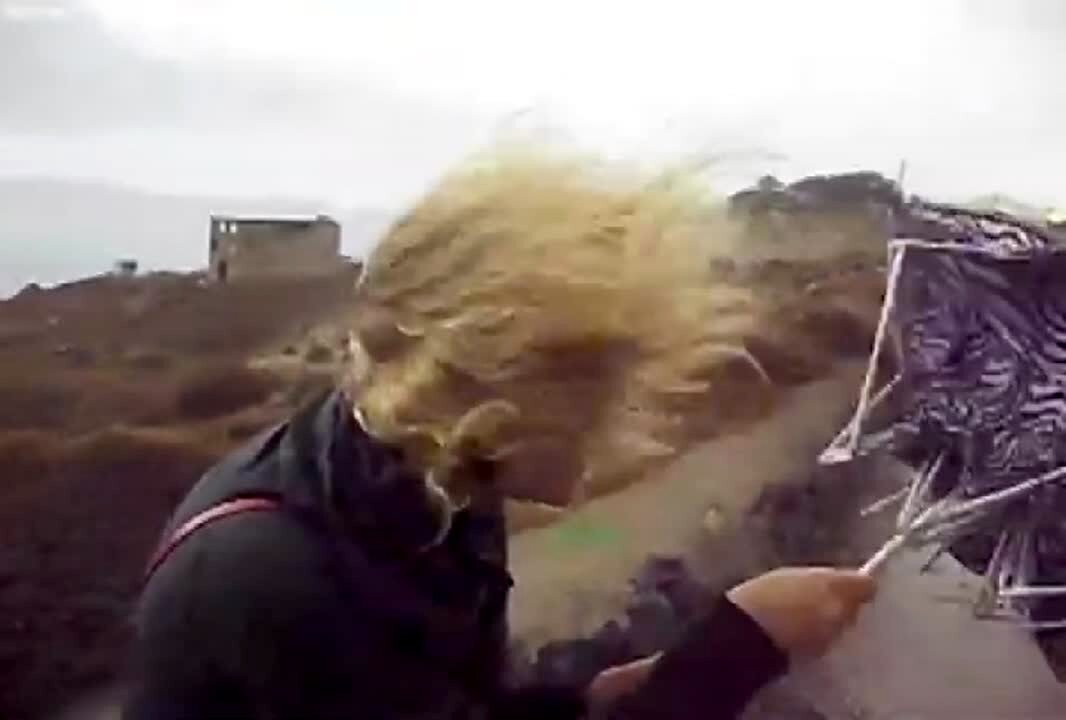 A woman exclaims that she can't believe how windy it is outside, then an umbrella on her deck opens and flies away.