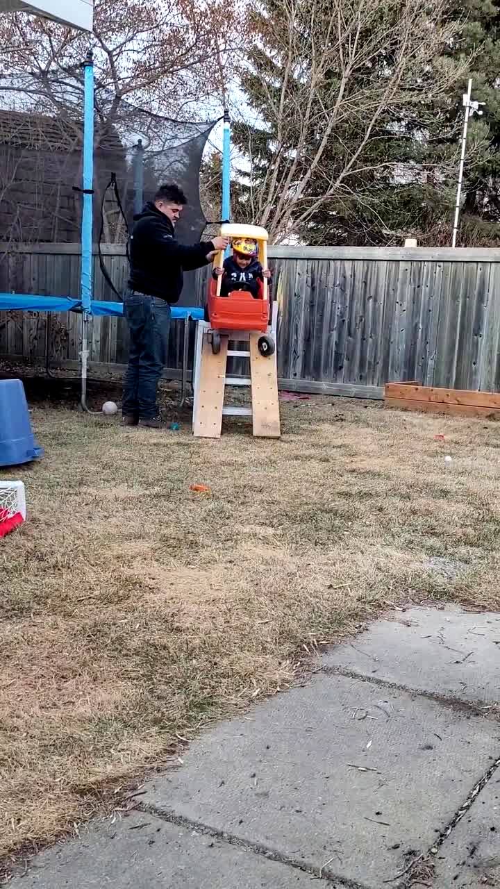 A young boy is in a toy car on a ramp in a backyard. A man holds onto the car and then lets it go down the ramp. The car falls forward and breaks. A woman off camera laughs along with the man.