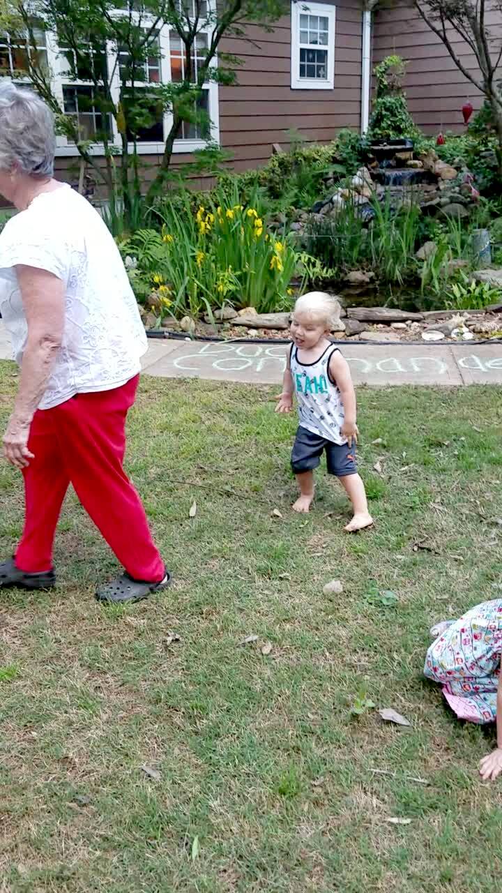 A woman behind the camera tells two women on a large lawn chair to slide back, then they slide all the way back into the chair.
