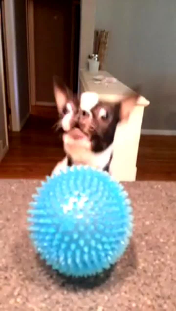 A Boston terrier dog hops up and down behind a table where his ball sits in front of the camera.