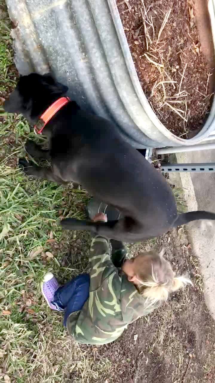 A young girl holds a bucket under a dog in the yard. The woman with the camera asks what she is doing and the girl says "milk a cow." The dog walks away and the girl follows it with the bucket. The dog lays down and the girl reaches to grab its penis.