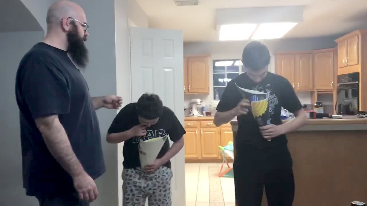 A woman puts a piece of chocolate in front of a young boy for the Toddler Temptation Challenge in the kitchen. The boy picks up the chocolate and gulps. He walks away to talk to his dad and comes back to check on his chocolate. He leaves again and a dog stands up and eats the chocolate off the table. The boy notices and tells his parents.