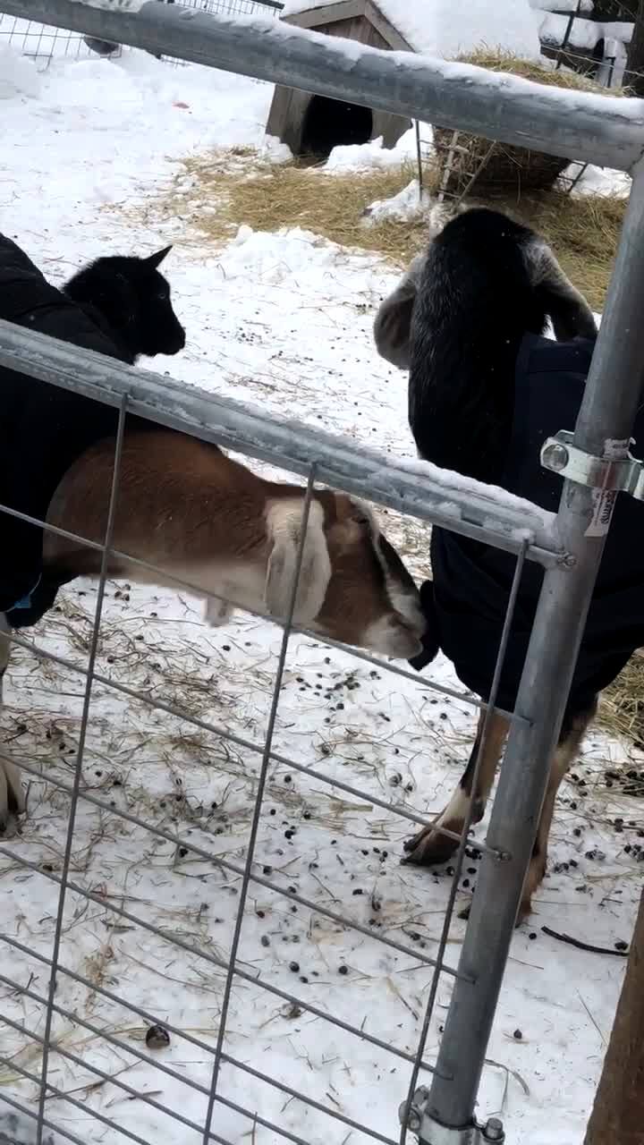 Goats and sheep bleat loudly. One goat sounds like a small child yelling. People laugh.