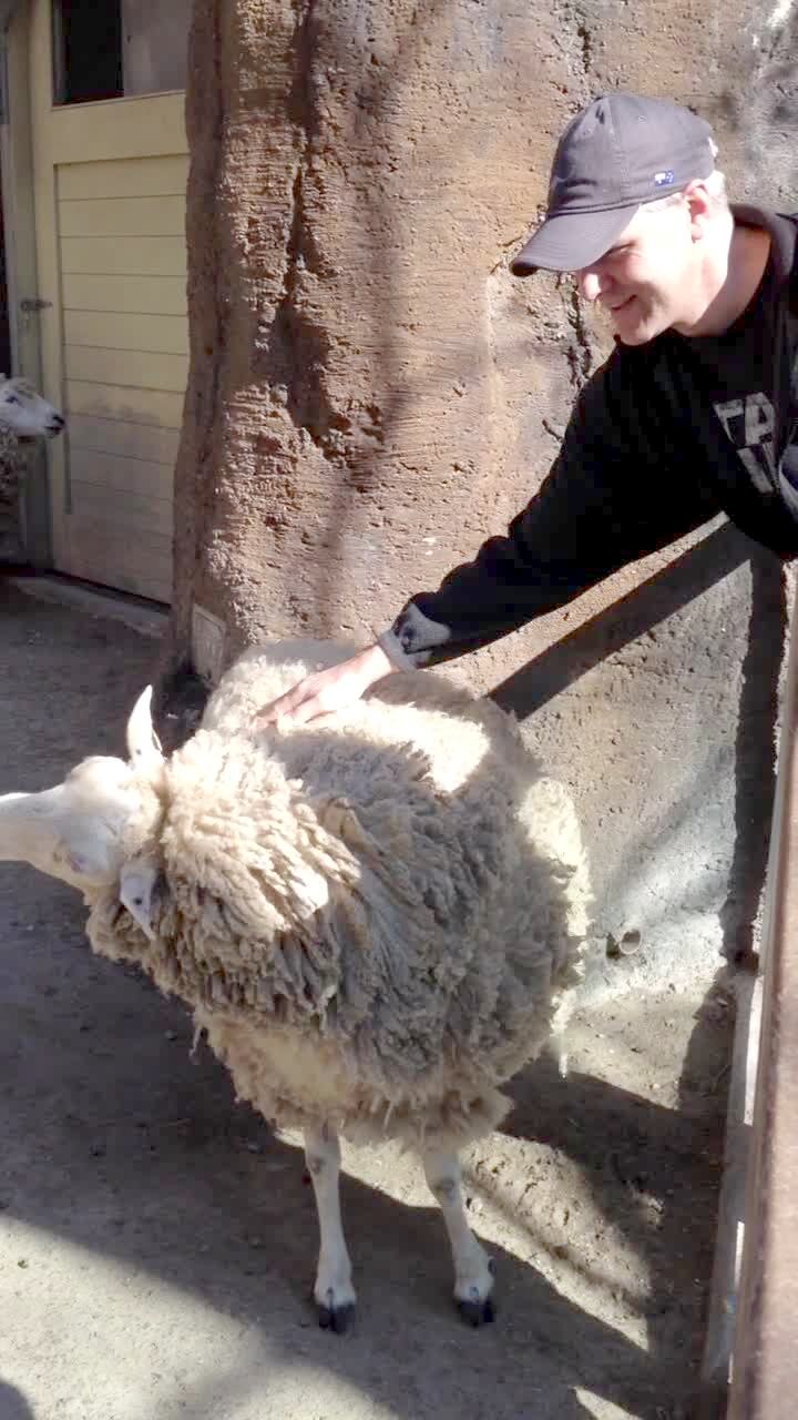 A man pets a sheep and when he stops, the sheep throws his head back towards his back side as if to tell the man to pet him again.