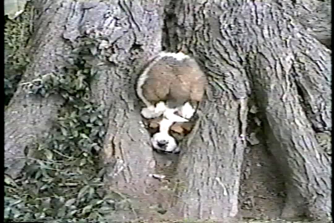 2 St. Bernard puppy dogs stuck in tree roots on top of each other; each facing opposite ways, looks like they're 1 dog bent in half