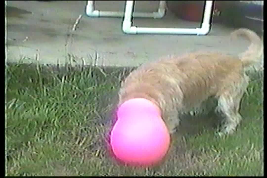 Dog gets head stuck in a bucket with a smiley face on it, other dog plays with him, funny visual.