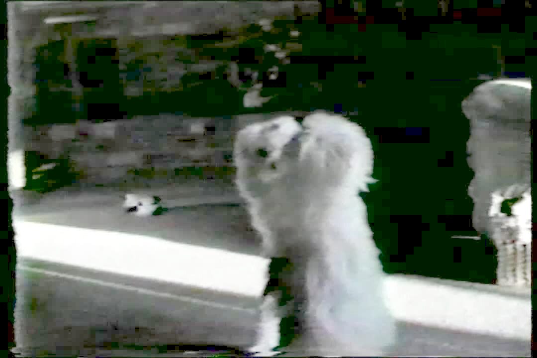 Bigger dog pulls smaller dog around by tail. MOVE IT ON OVER