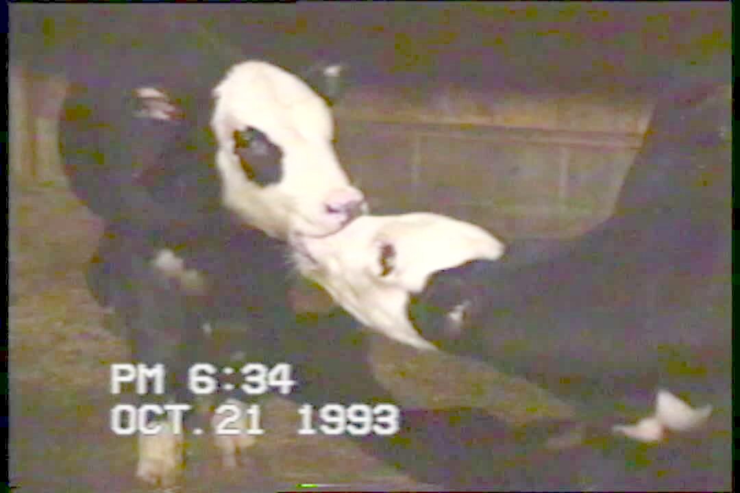 Two goats stare at their reflections in a mirror. One of the goats charges at its reflection which causes the mirror to fall