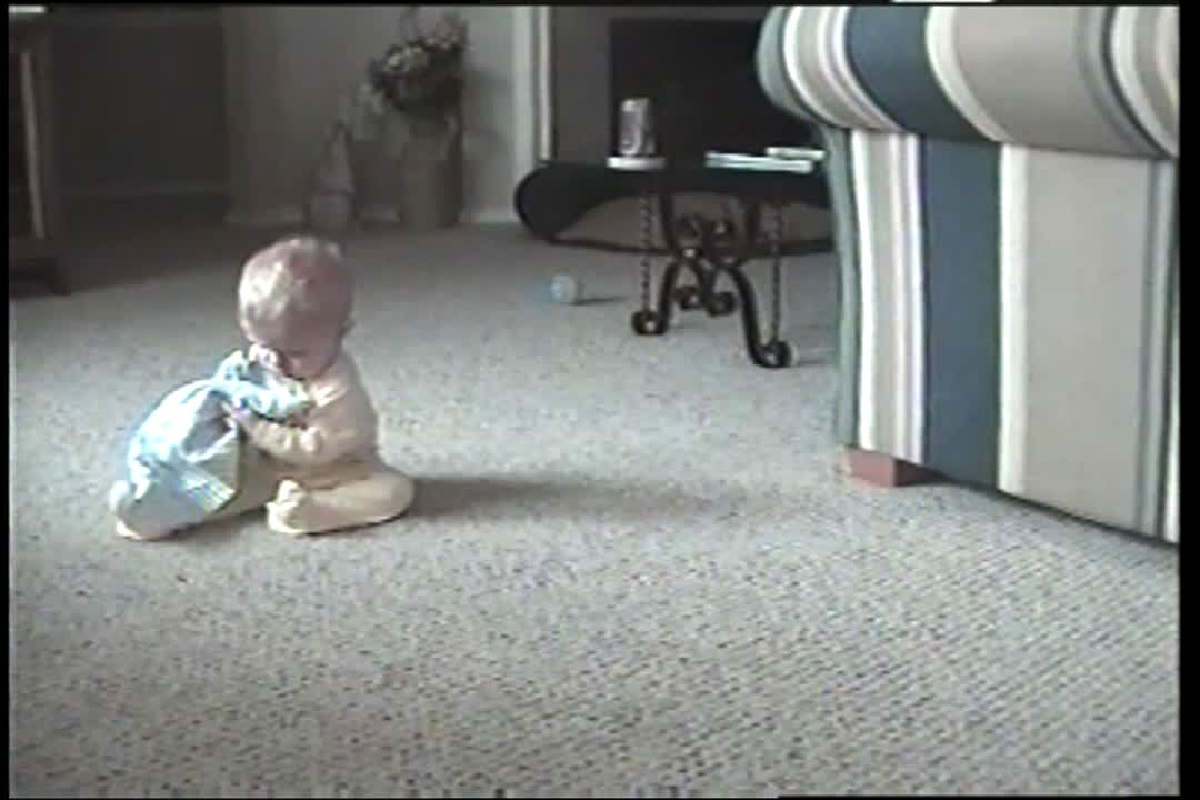 Baby boy sits on the floor, 2 dogs run through room with rope in their mouths & clothesline the baby, knock him over. With recovery.