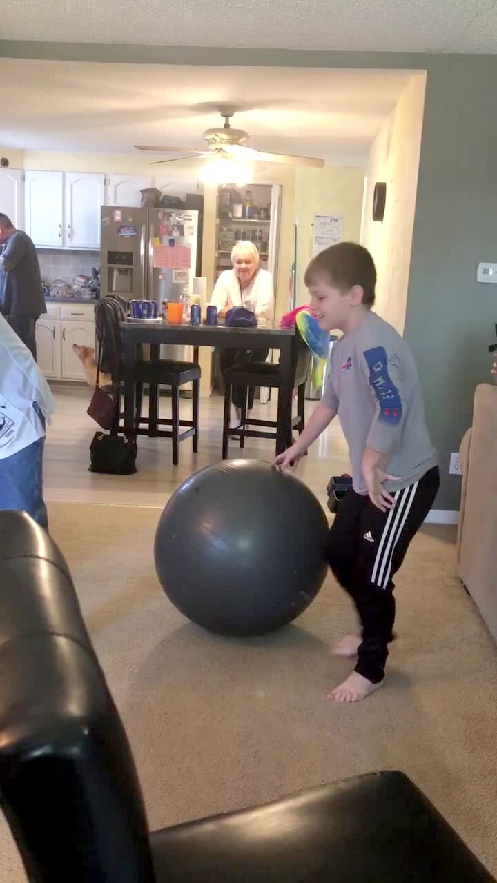 A man and a young boy jump on an exercise yoga ball. The last time he does it, the young boy kicks the ball out from under him and the man belly flops on to the floor.