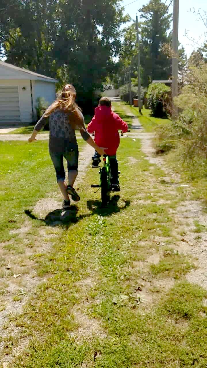 A young boy plows into a bush in a backyard while he rides a motorized bicycle. Security footage.