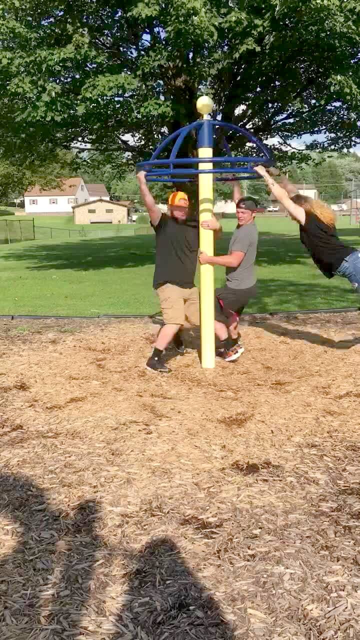 A woman on the back deck makes a video and says some sweet things about her friend with a dog in her arms. At the end, two young girls pop out from under the table but one hits her head on the way up.