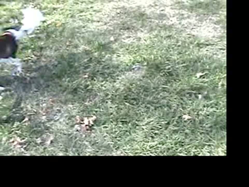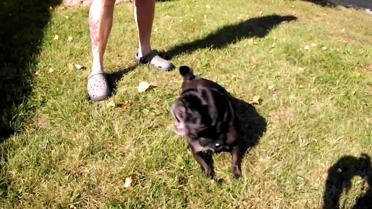 A man puts a pug dog on the ground after "Winding him up" and has him spin in circles in the yard.