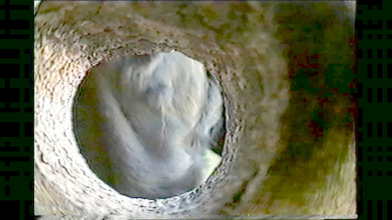 A man says that his white Husky dog was dirty when he came into the house from the yard. He then turns the camera to show a Golden Retriever dog, smiling and lying in a large hole in the yard.