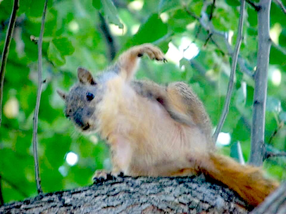 A wild monkey runs at a man and chases him as he runs away through a park and screams and laughs.