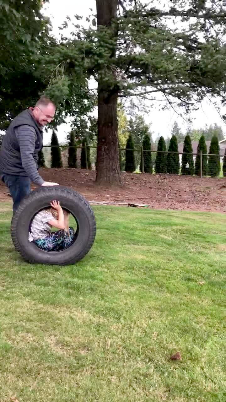 A young girl sits inside a tire in a yard and a man rolls her down the hill and another young girl tries to catch the tire and it knocks her down.