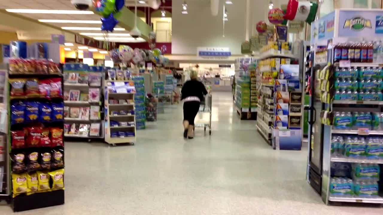 Baby girl holds onto the bottom rail of shopping cart and gets dragged around the store floor on her belly.