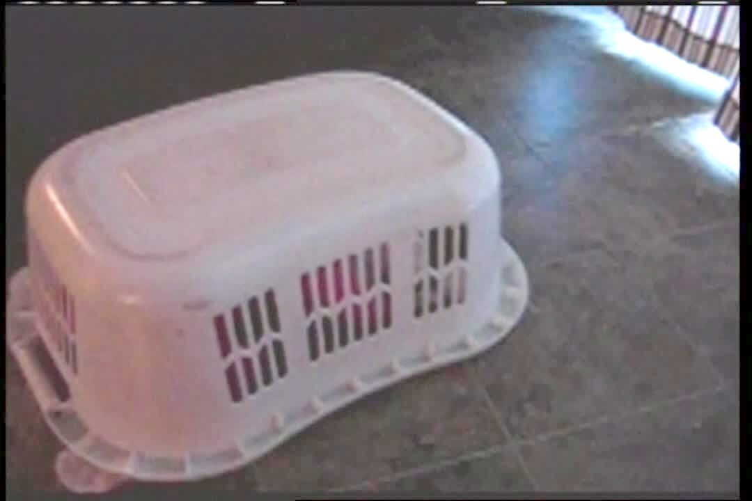 Baby girl walks around house pushing a laundry basket. She falls & the basket flips on top of her, trapping her in cage. Cute. Long clip