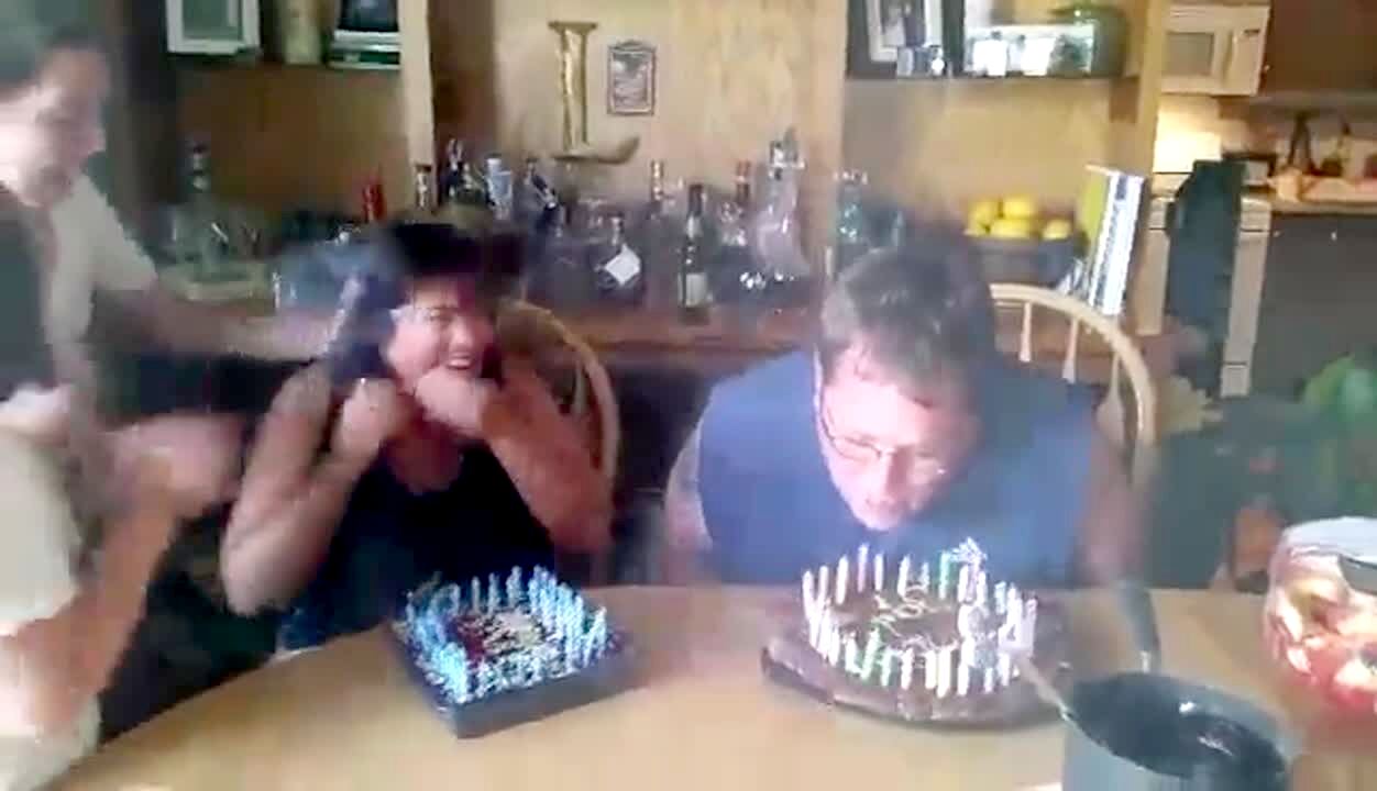 A man and a woman sit at a table with two birthday cakes, and blow out their candles. The woman's hair catches on fire, and her family screams.