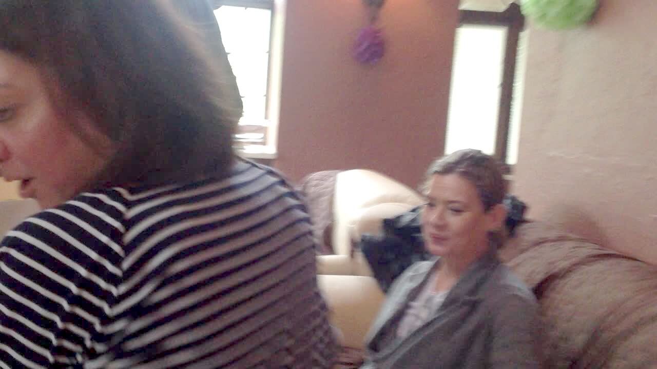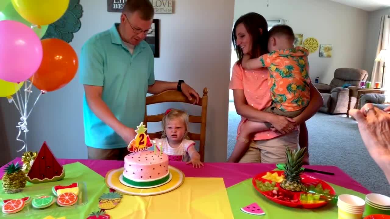 A group of people sing "Happy Birthday" to twin tot girls in the living room and the camera turns to show them both asleep in their highchairs.