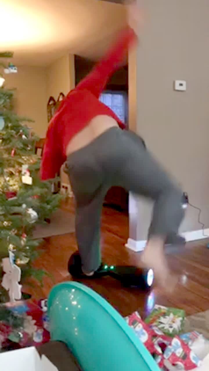 A man rides a hoverboard in the living room and falls over, knocking down the Christmas tree.