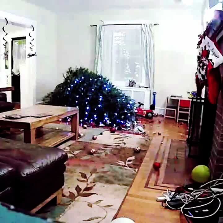A young boy who pulls on decorated a Christmas tree. The tree falls on top of him, appearing as if he's been crushed. His mother checks on the noise and the boy safely crawls away. Security footage