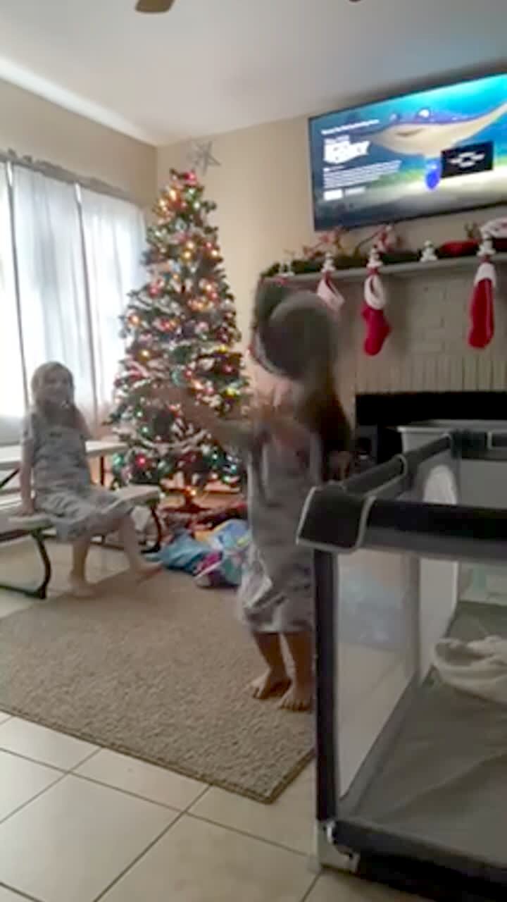 A young girl opens a small gift bag and a senior woman tells her that the gift bag is her own present. The girl says that nothing is inside and tells the senior woman "you guys must have been on the naughty list."