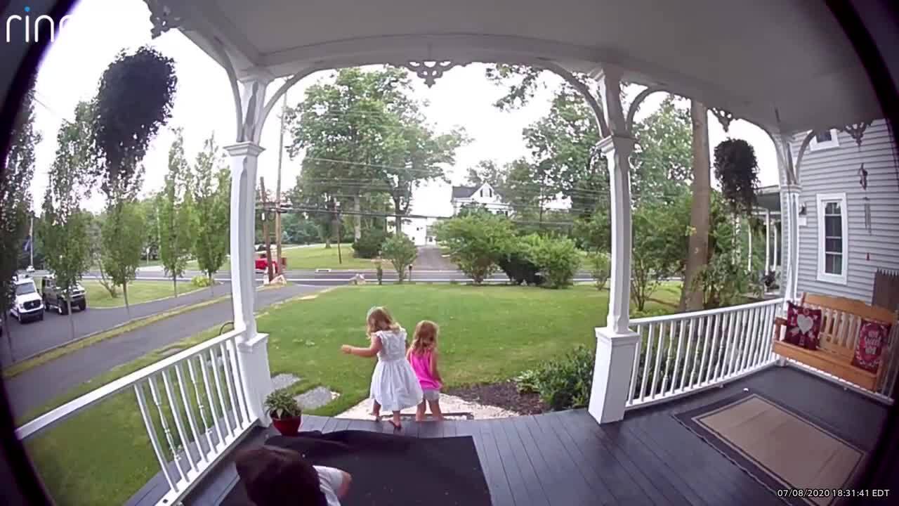 A young girl, a young boy and a woman walk outside and all three slip and fall on the icy steps on the front porch, one after another after another. Security footage