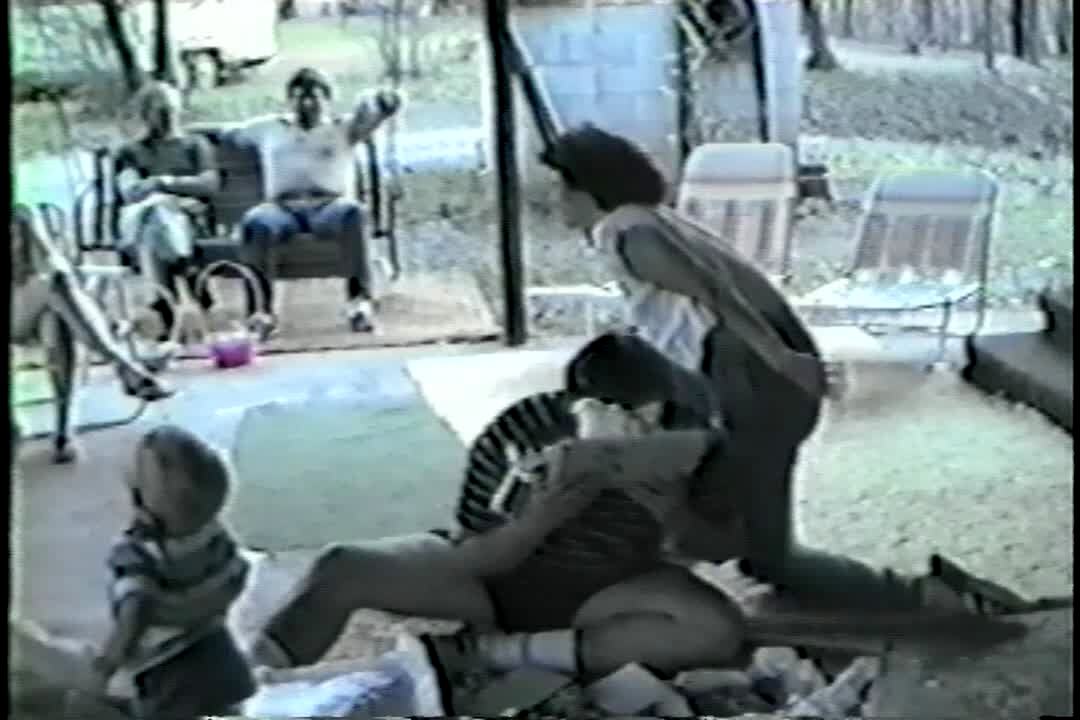 A man asks a tot girl is a cake smells funny and then he pushes her face into the cake outdoors. She then returns the favor to him.