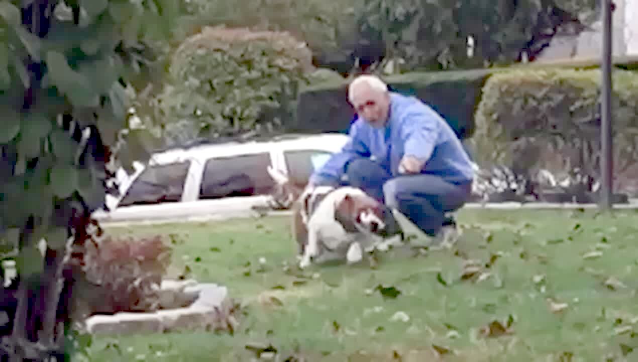 A pit bull runs around in the yard, then knocks the camera over when he runs into it. Security footage.