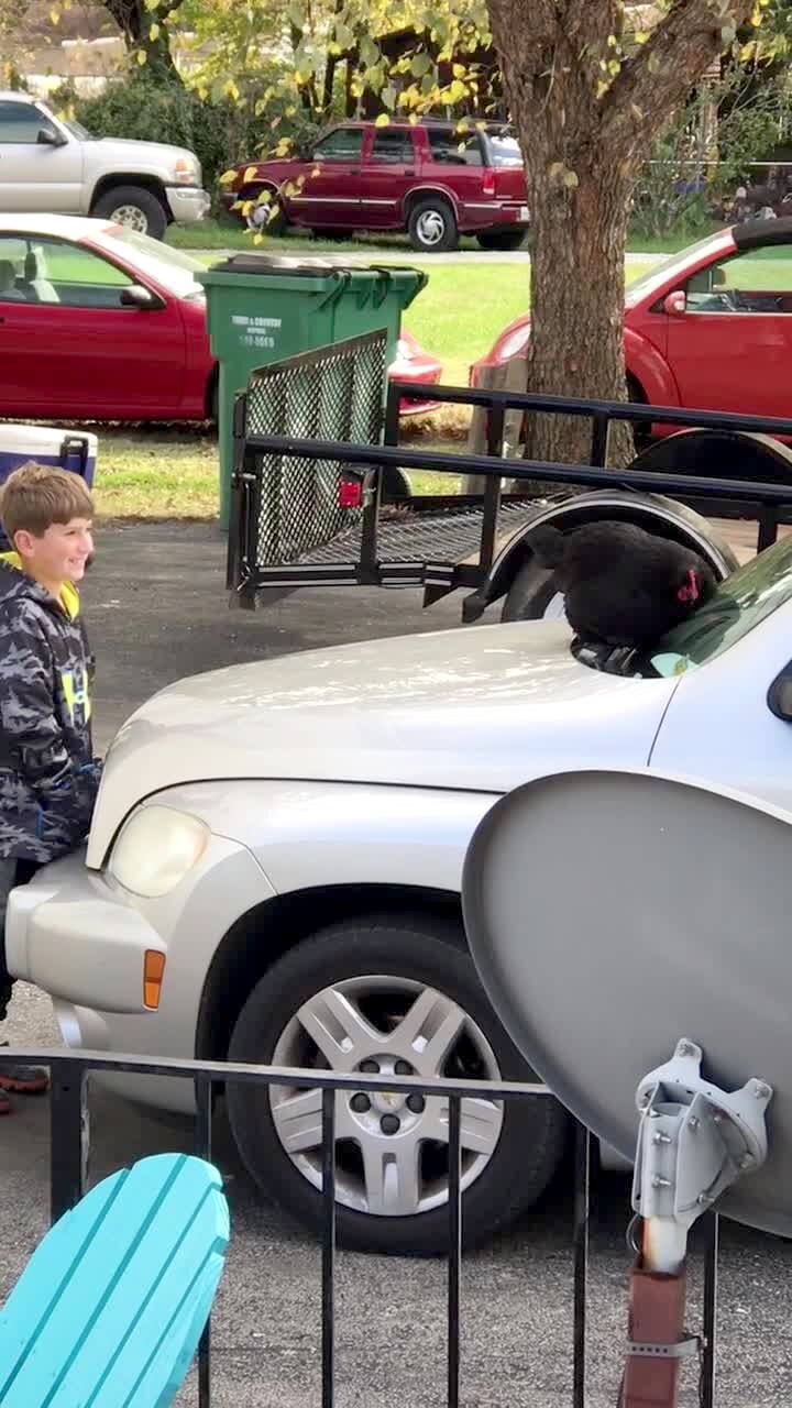 A chicken lays an egg on a car. Her owner films and commentates. A young boy wait to catch the egg when it rolls down the hood of the car. The Chicken lays the egg.