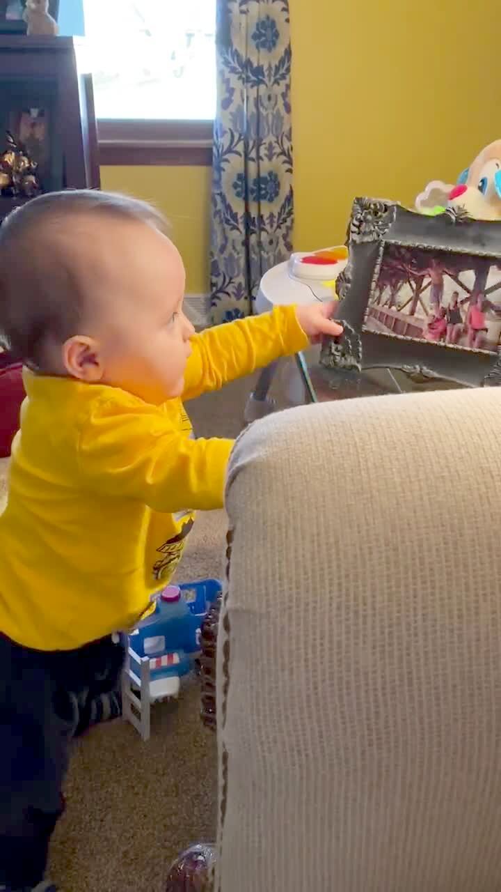 A baby boy in a living room plays with a picture frame on a table. The woman with the camera tells him no and he turns around and gives her a cheeky look. He accidentally knocks the picture frame over and turns around and looks shocked.