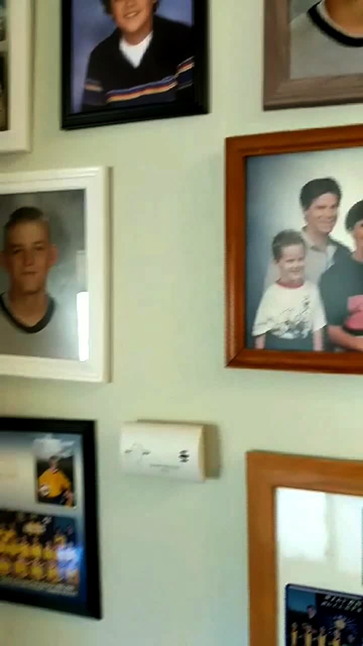 A man with the camera asks his mom if she likes a photo of his brother that she has put up on the wall in her home. He then shows her than she has put up the same photo not twice but three times around the house.
