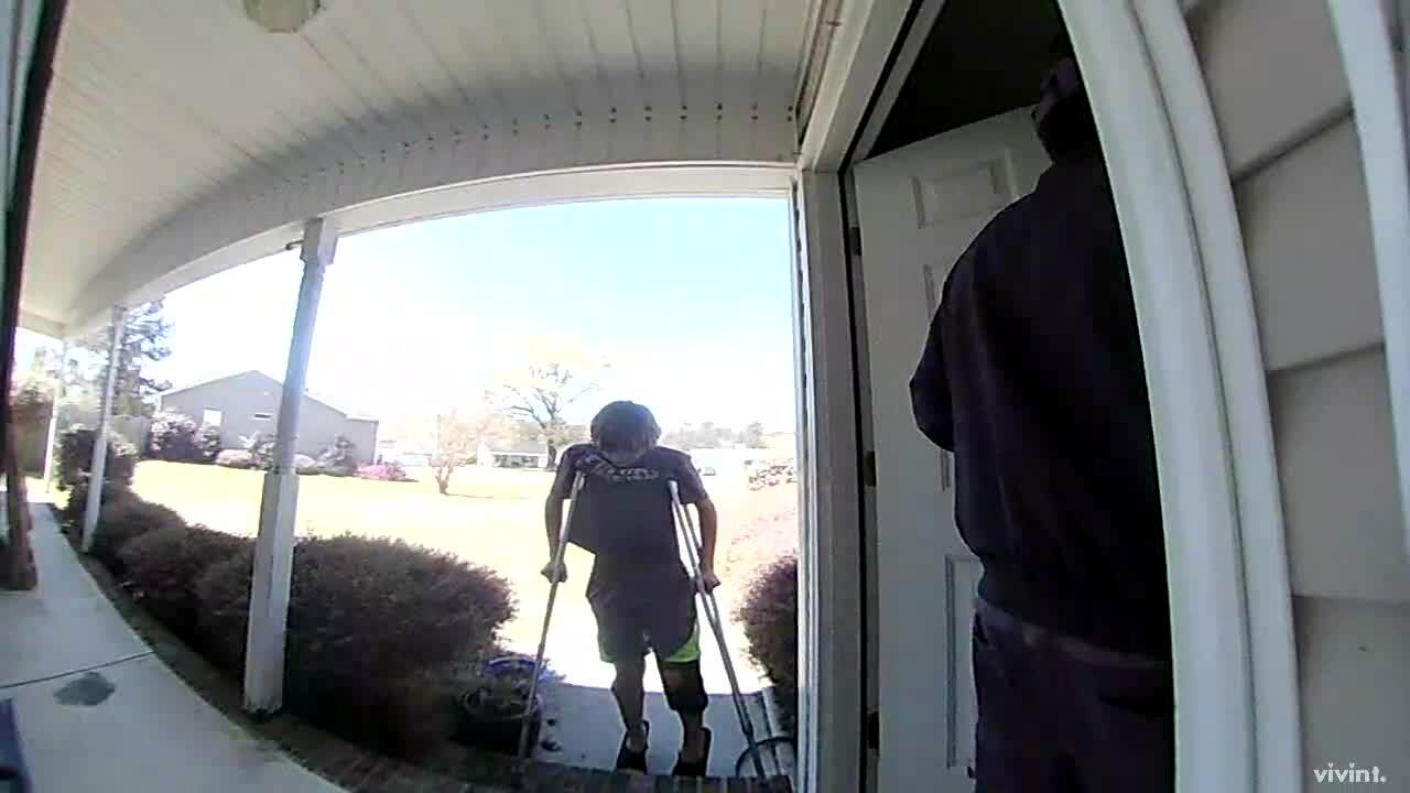 A young boy struggles to go up a front step of his house on crutches and falls down. Home security footage.
