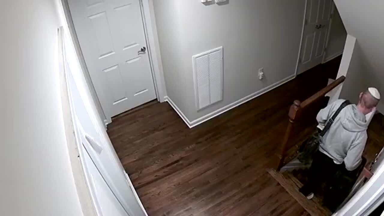 A man slips and falls down a flight of stairs in a house. Home security footage.